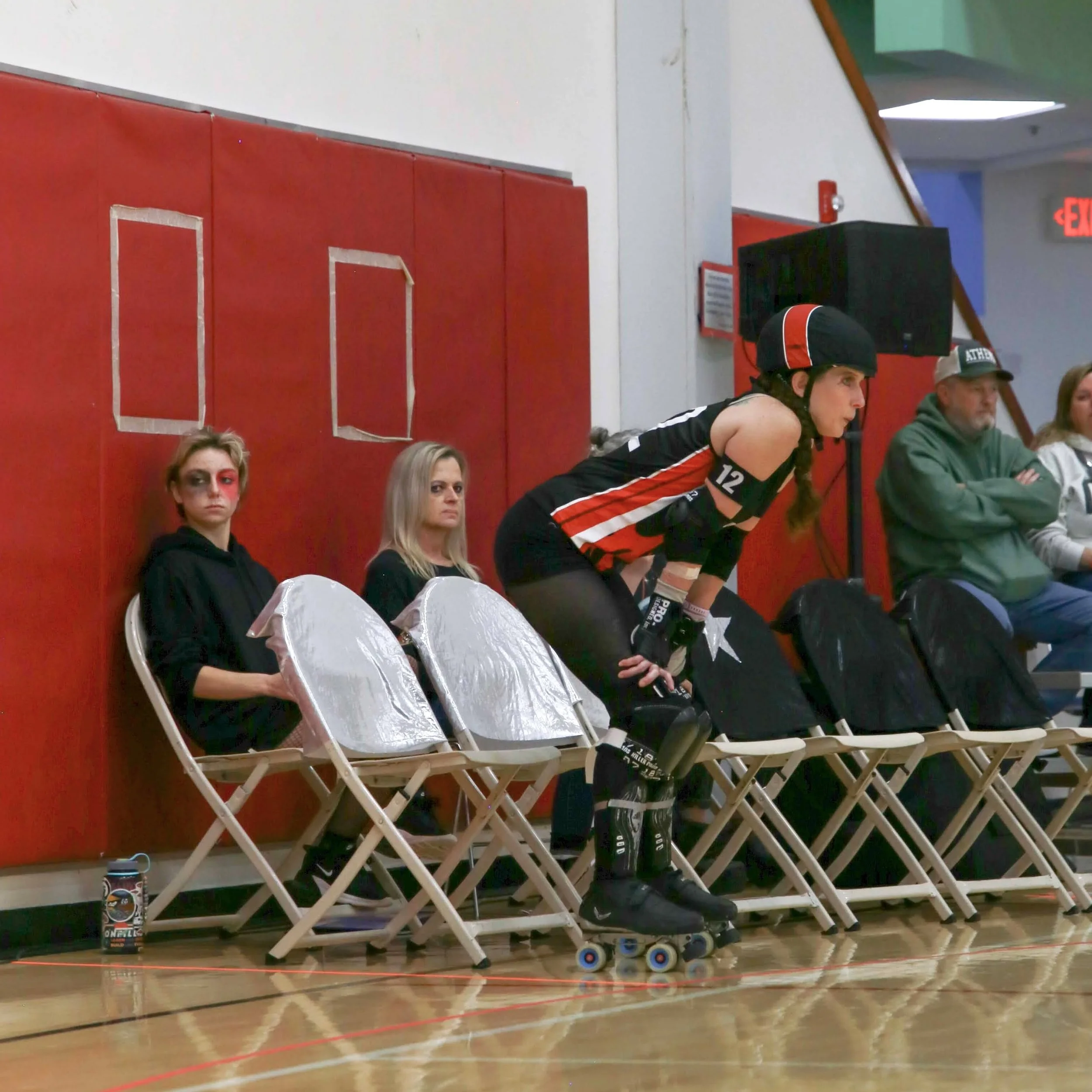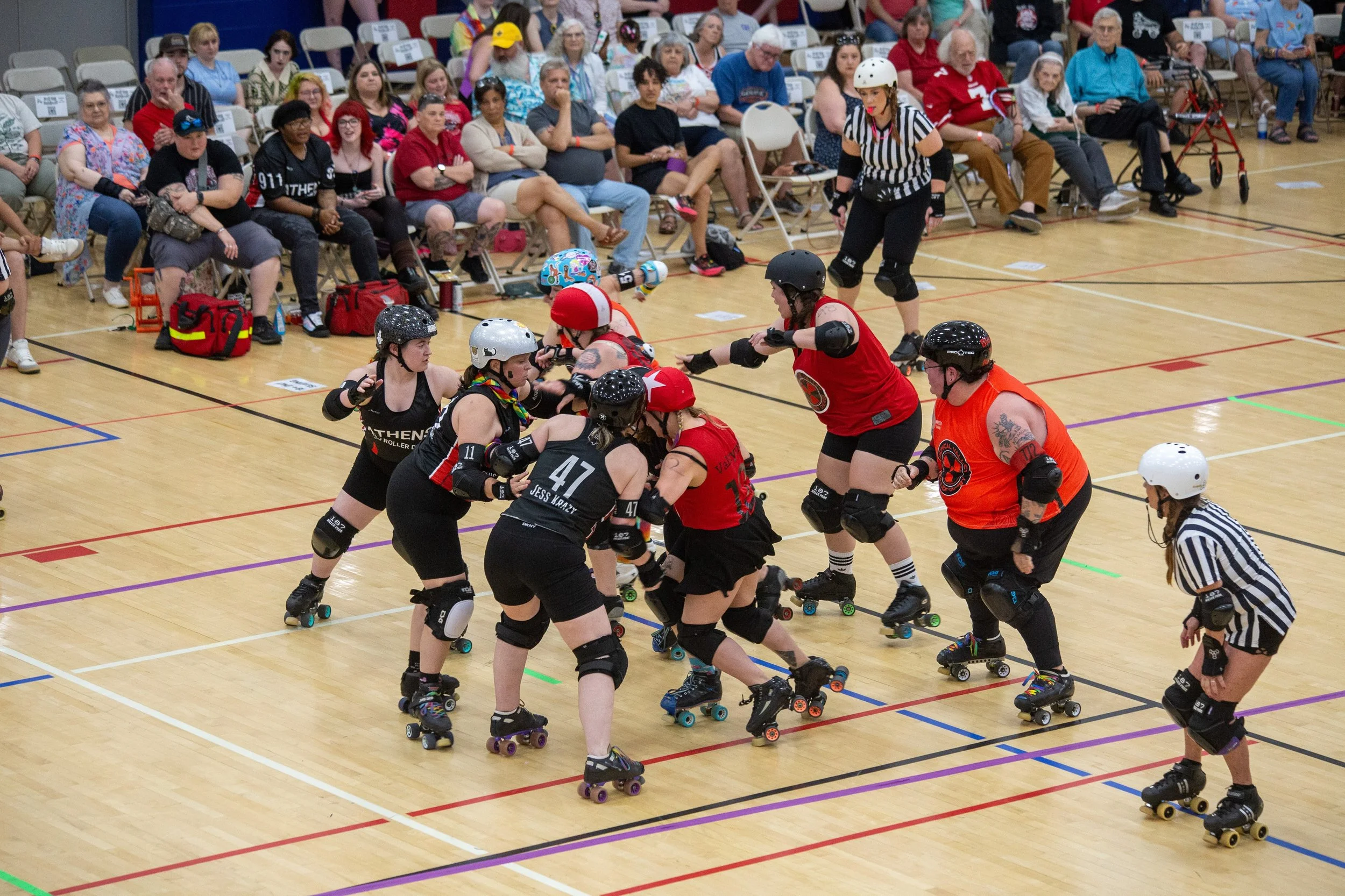 Flat track roller derby is a fast-paced, full-contact team sport that requires speed, strategy, and athleticism. Two 15-skater teams play two 30-minute periods. Each period consists of multiple “jams.” Each jam is an opportunity for both teams to score points, and ends after 2 minutes or when the Lead Jammer calls off the jam.